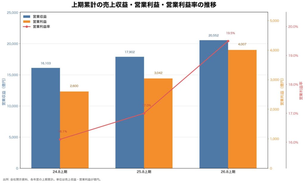 2026年8月期上期の売上収益は2兆552億円で前年同期比14.8%増、営業利益は4,006億円で同31.7%増、親会社の所有者に帰属する中間利益は2,792億円で同19.6%増となった。事業利益は3,869億円で同28.3%増、営業利益率は17.0%から19.5%へ2.5ポイント改善している。